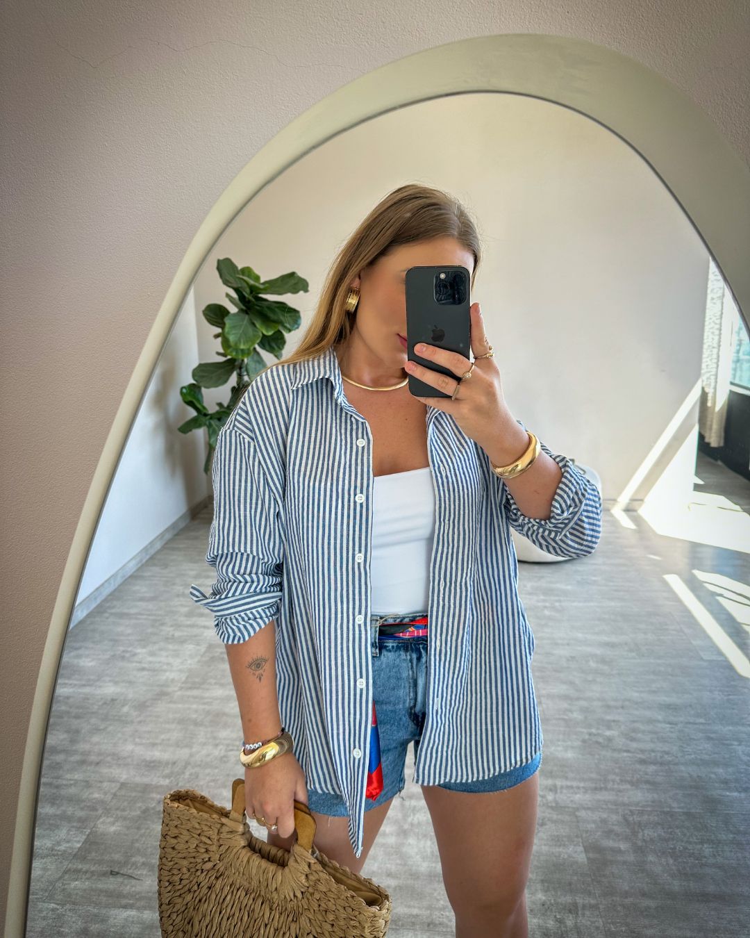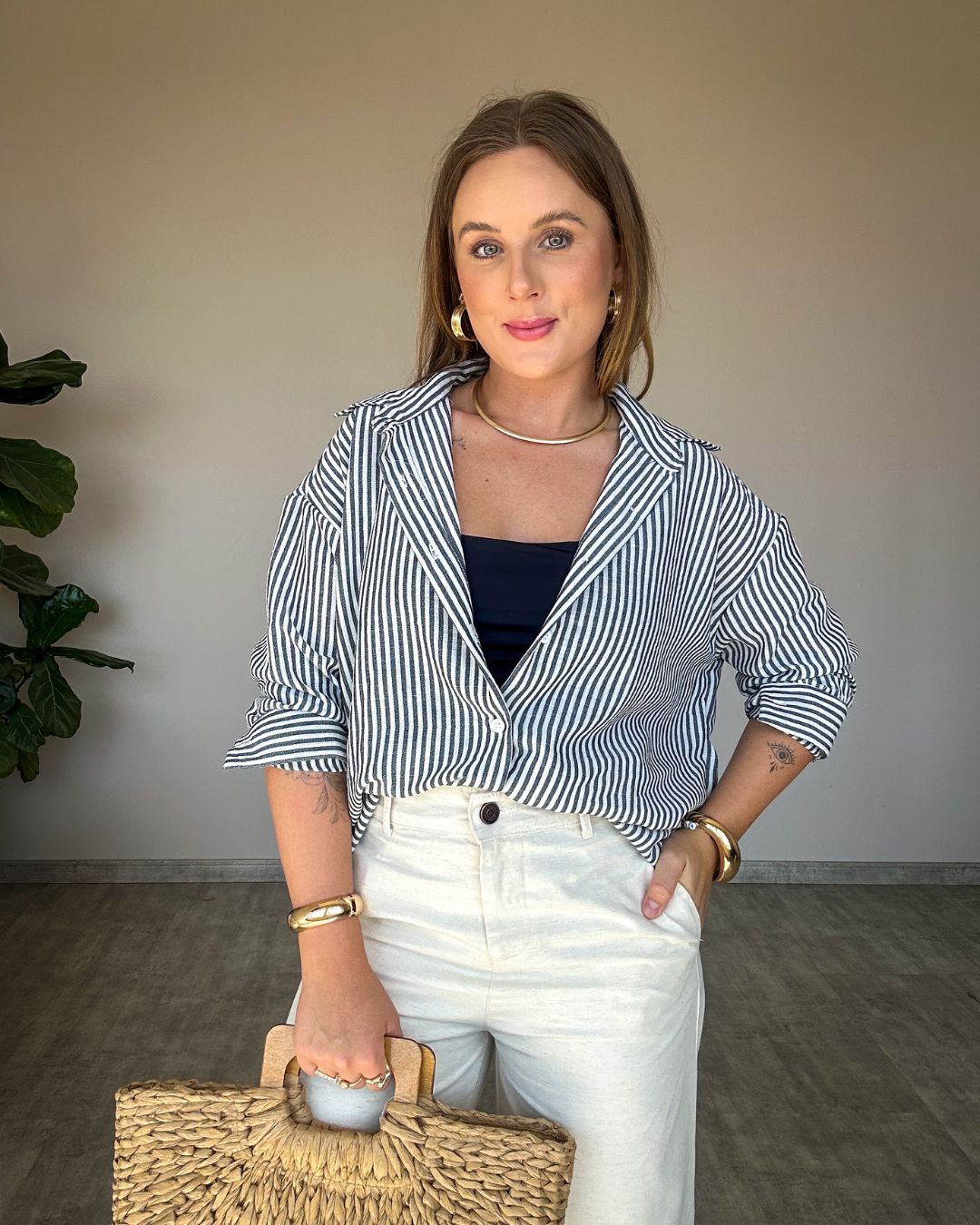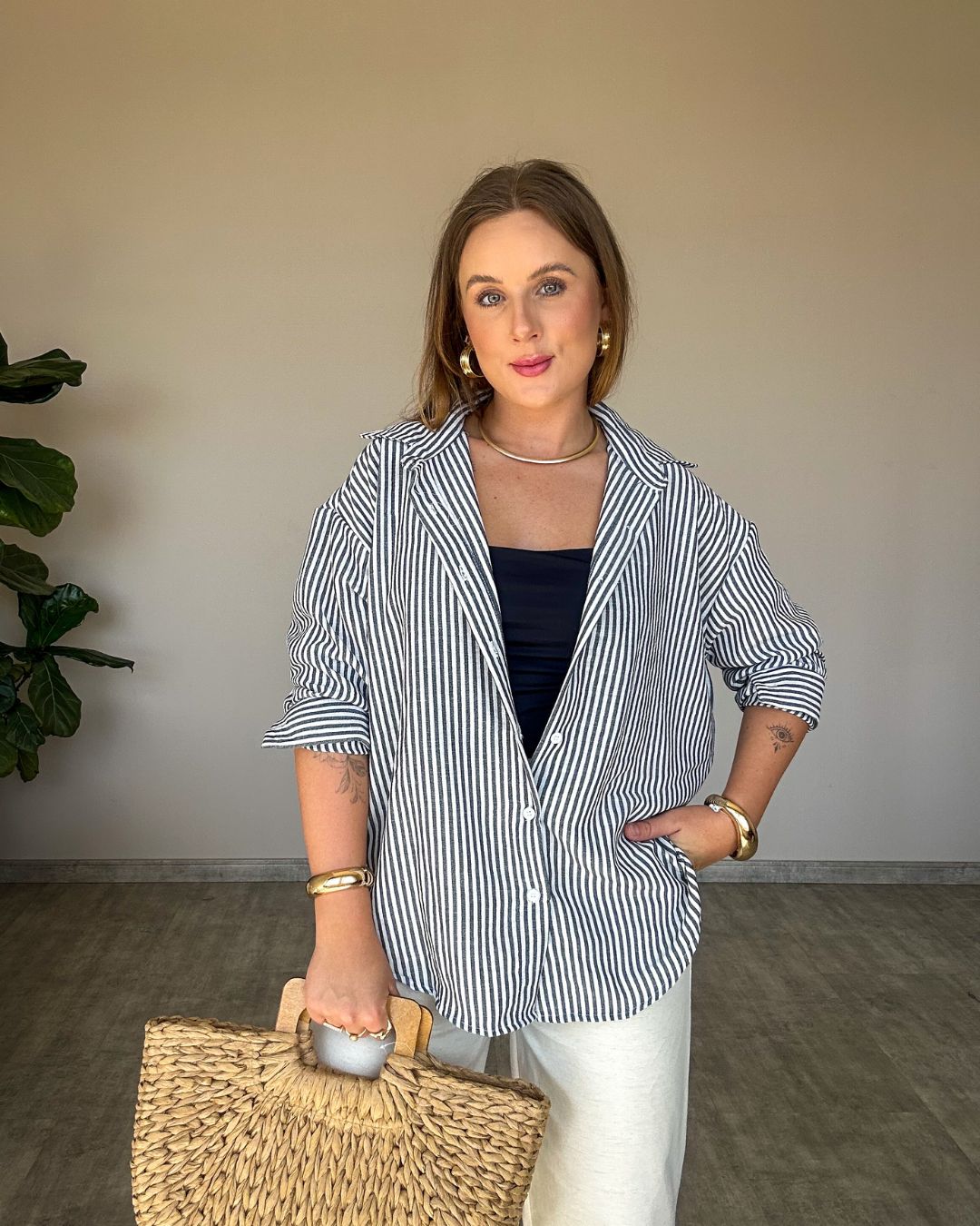 Possui modelagem ampla, mangas longas com punho ajustável, e barra arredondada, que permite usar tanto solta quanto por dentro da roupa ou amarradinha na cintura. As listras verticais alongam a silhueta e trazem aquele ar elegante que combina com qualquer ocasião — do trabalho ao fim de semana.