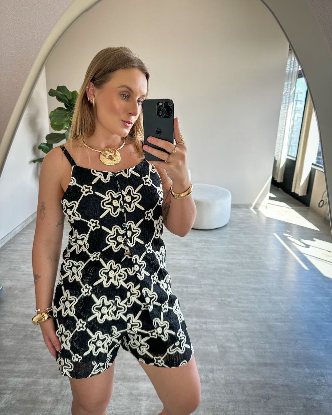 Esse conjunto é composto por blusa com alcinhas finas, que traz um toque delicado e feminino, e short com fechamento por zíper invisível, garantindo um caimento impecável e confortável.