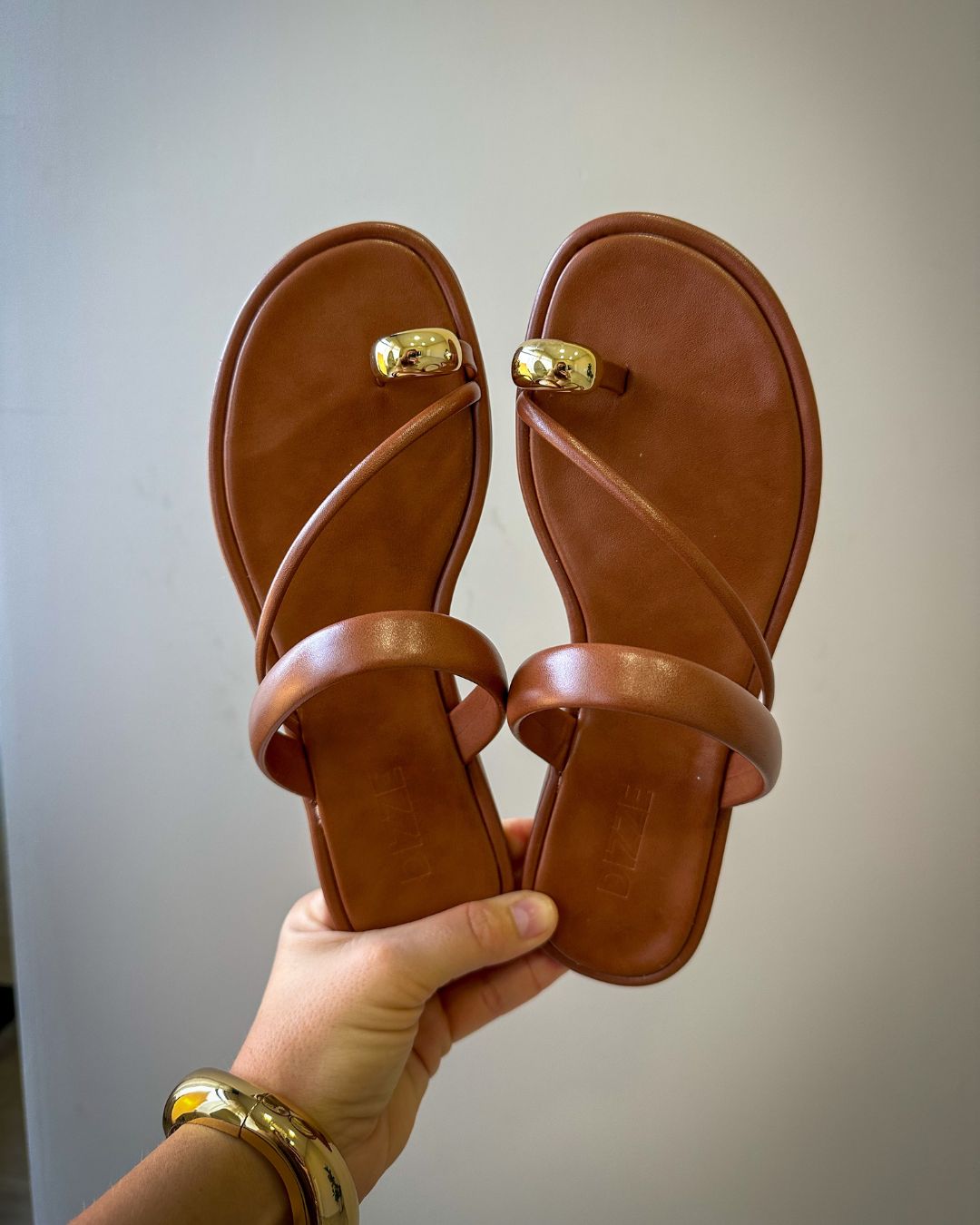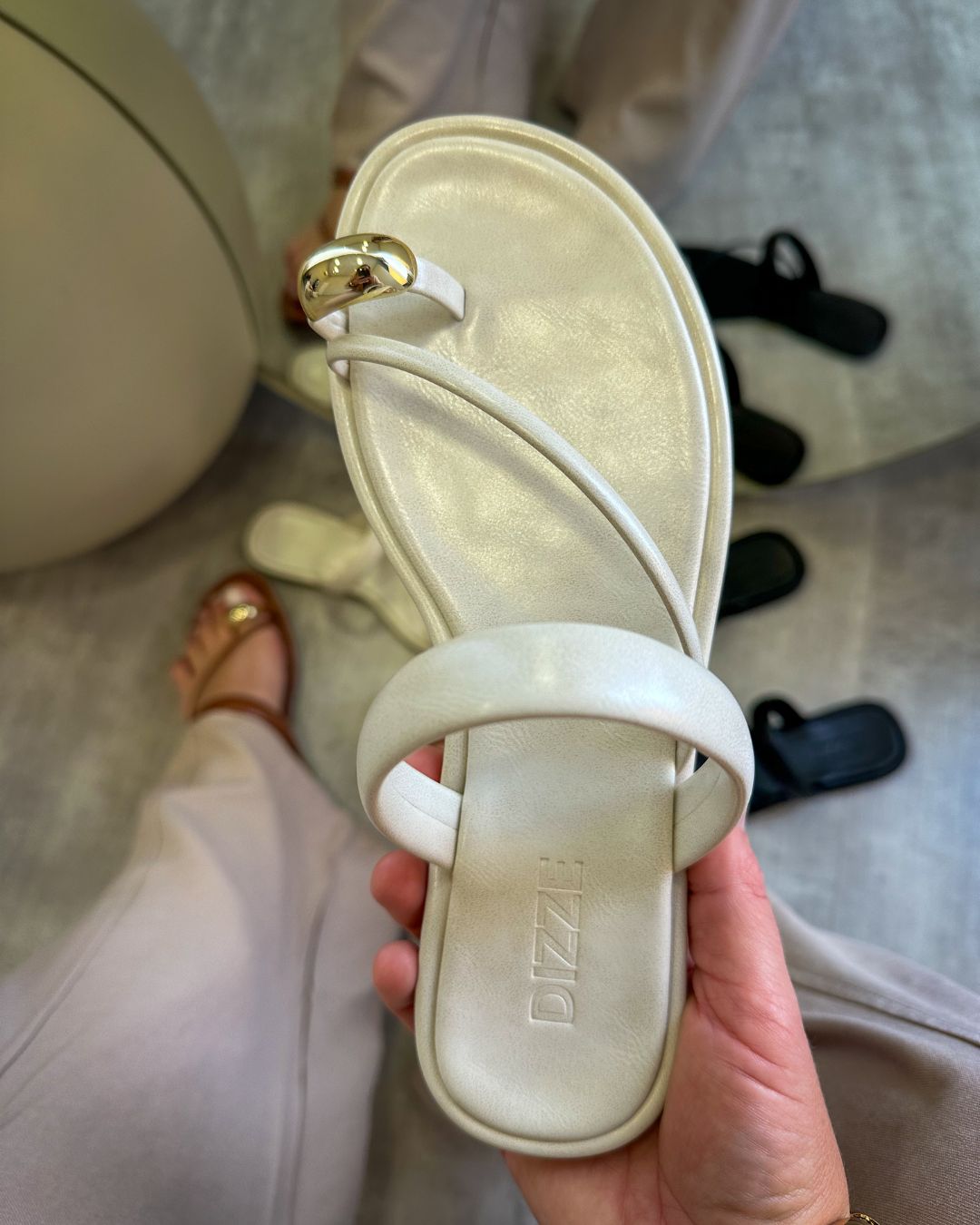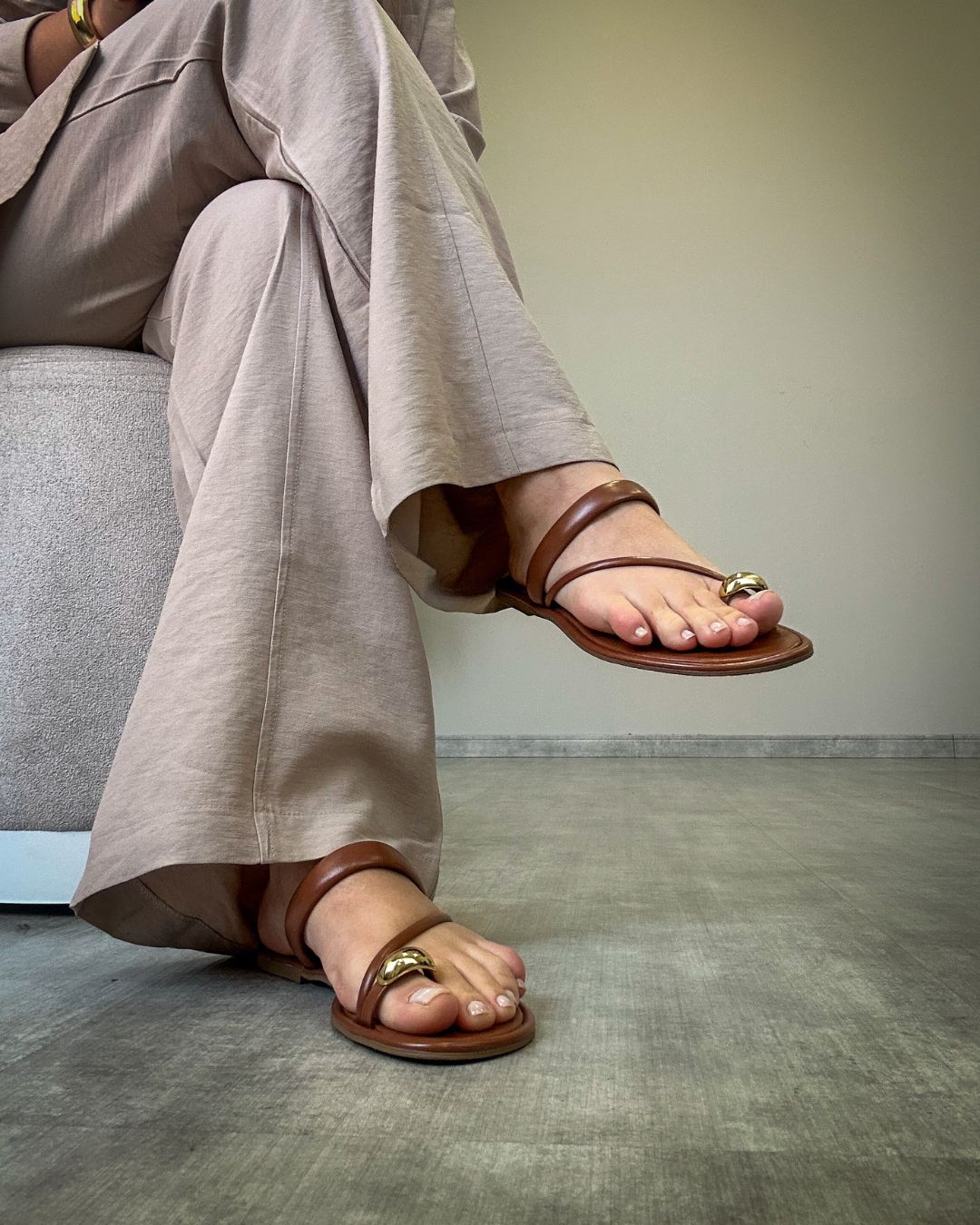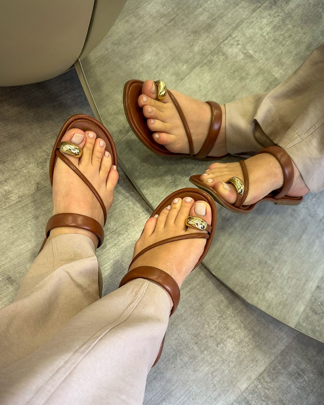 Com tiras finas cruzadas e detalhe no dedo, essa rasteira se destaca pela modernidade e pelo toque fashionista. O metal dá um ar contemporâneo, transformando o básico em algo sofisticado. Vai bem com vestidos, saias, shorts e calças, sempre acrescentando estilo.