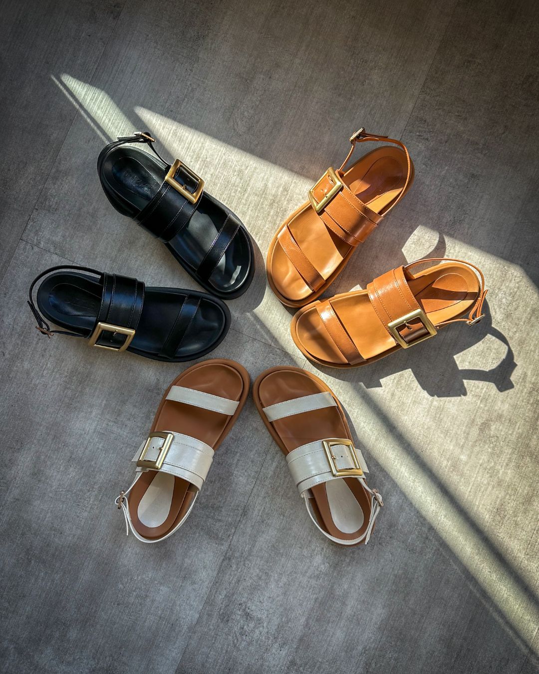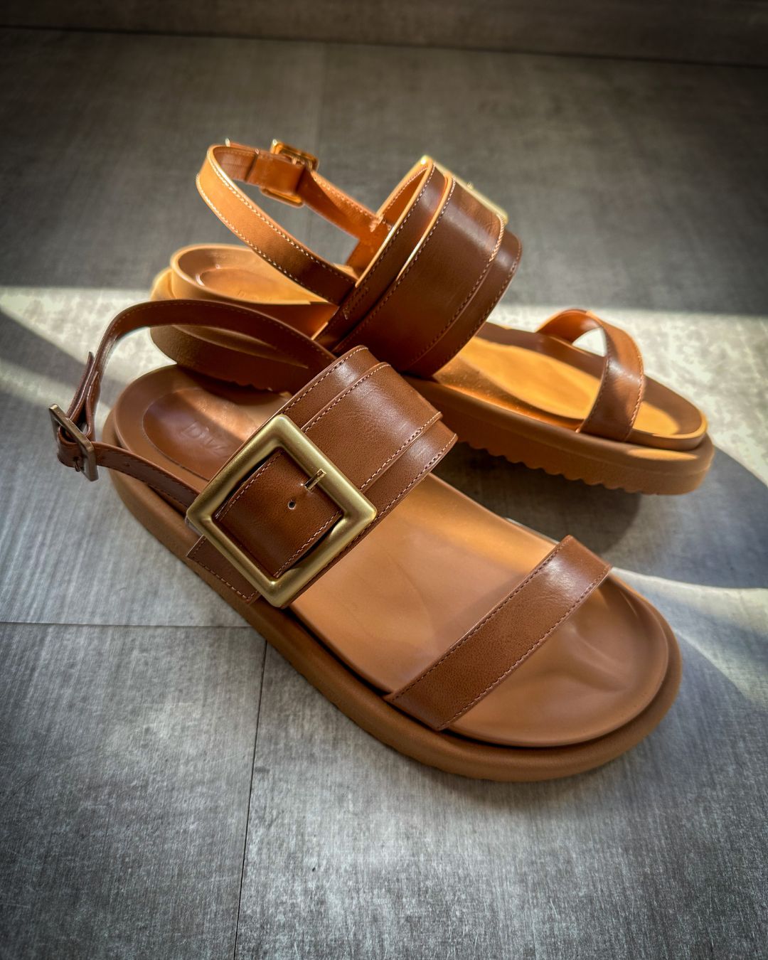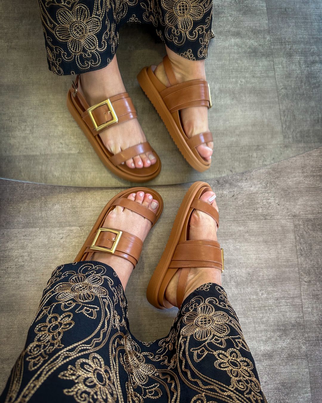 O cabedal com design moderno e tiras largas que proporcionam firmeza aos pés. O grande destaque é a fivela em metal, que além de ser funcional, traz um toque sofisticado e atual ao calçado.