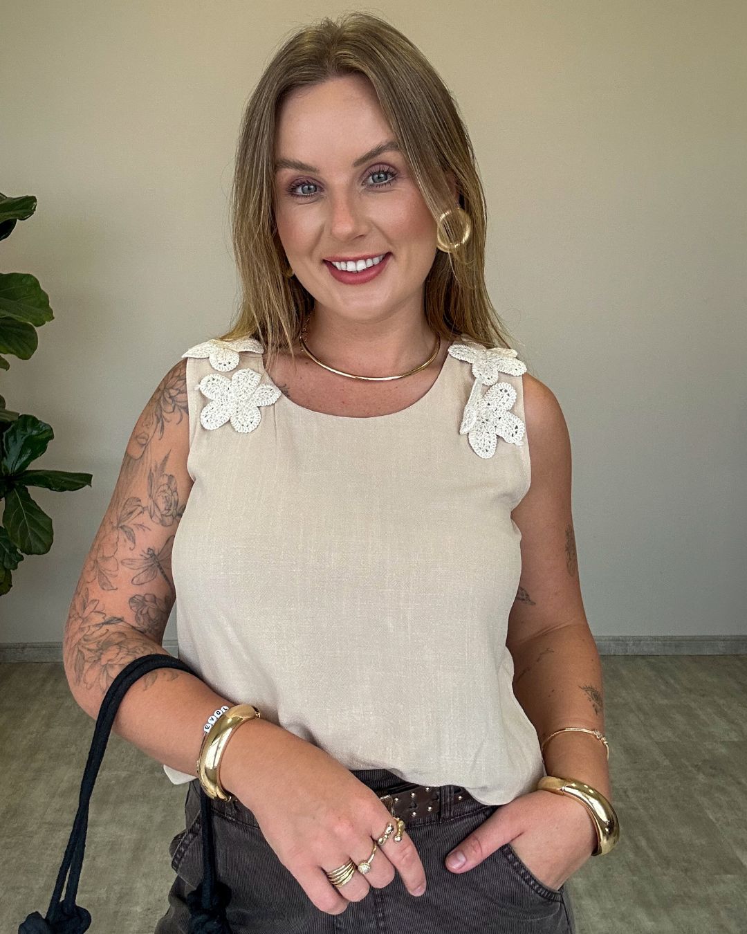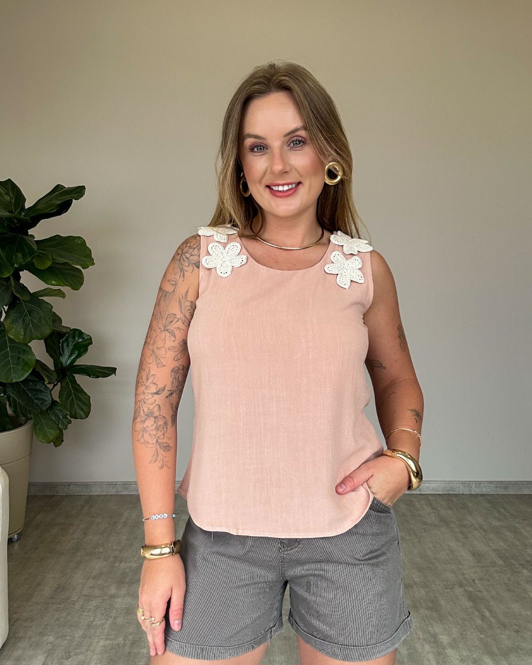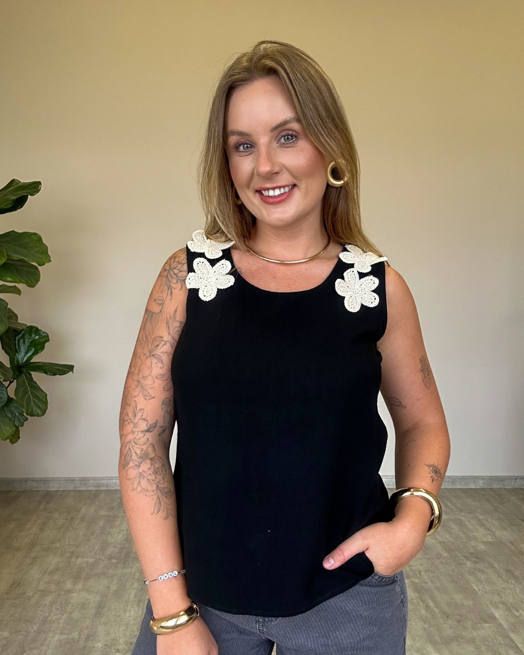 Regata em tecido leve e confortável, perfeita para compor looks frescos e estilosos nos dias mais quentes. O destaque fica por conta dos apliques de flores em crochê nas alças, que trazem um toque artesanal, delicado e romântico à peça.