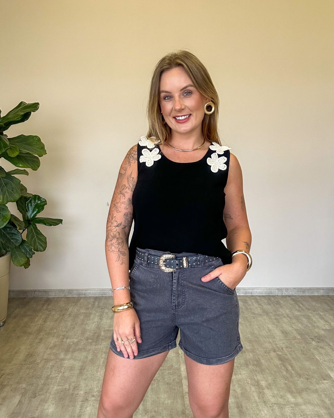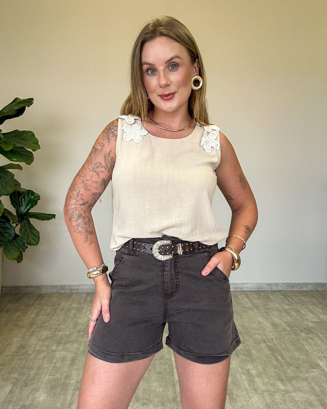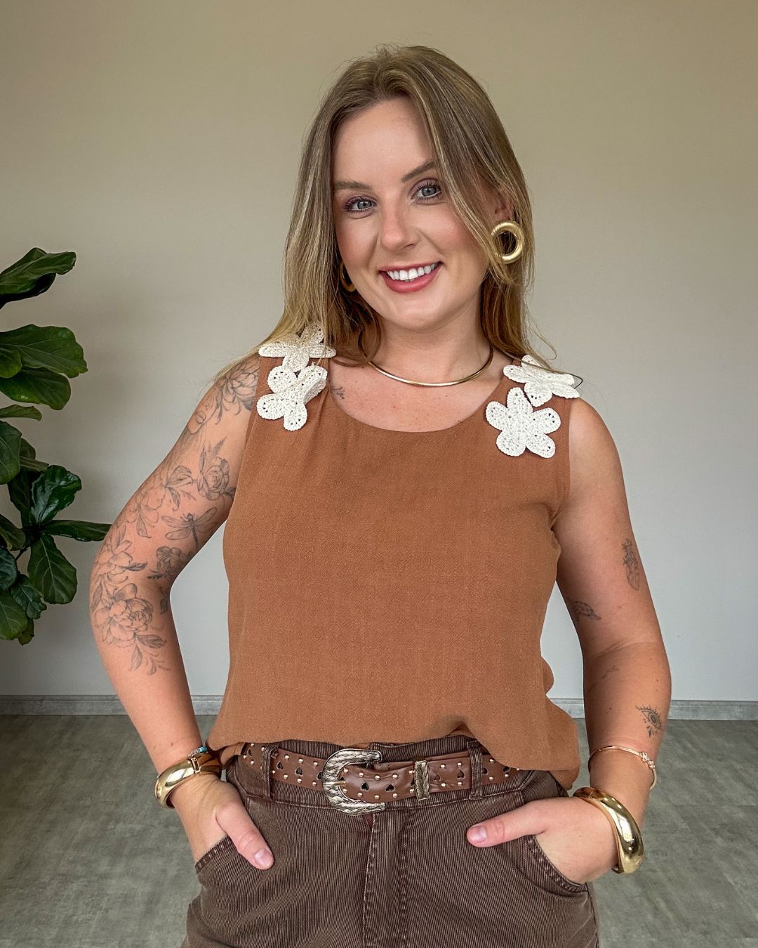 Regata em tecido leve e confortável, perfeita para compor looks frescos e estilosos nos dias mais quentes. O destaque fica por conta dos apliques de flores em crochê nas alças, que trazem um toque artesanal, delicado e romântico à peça.