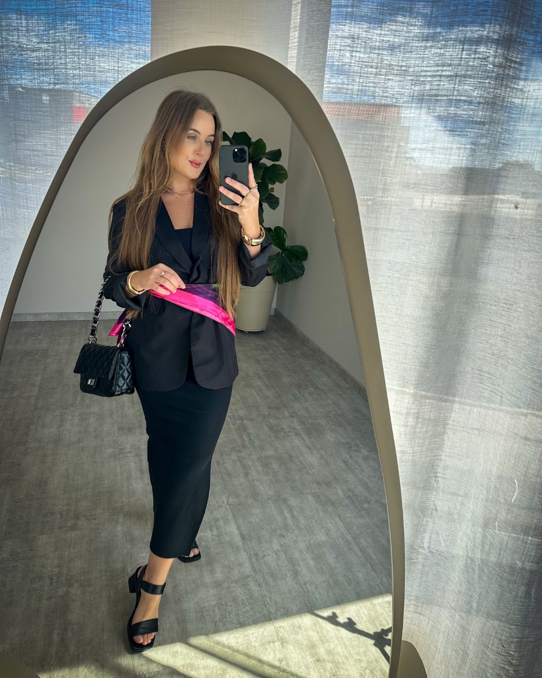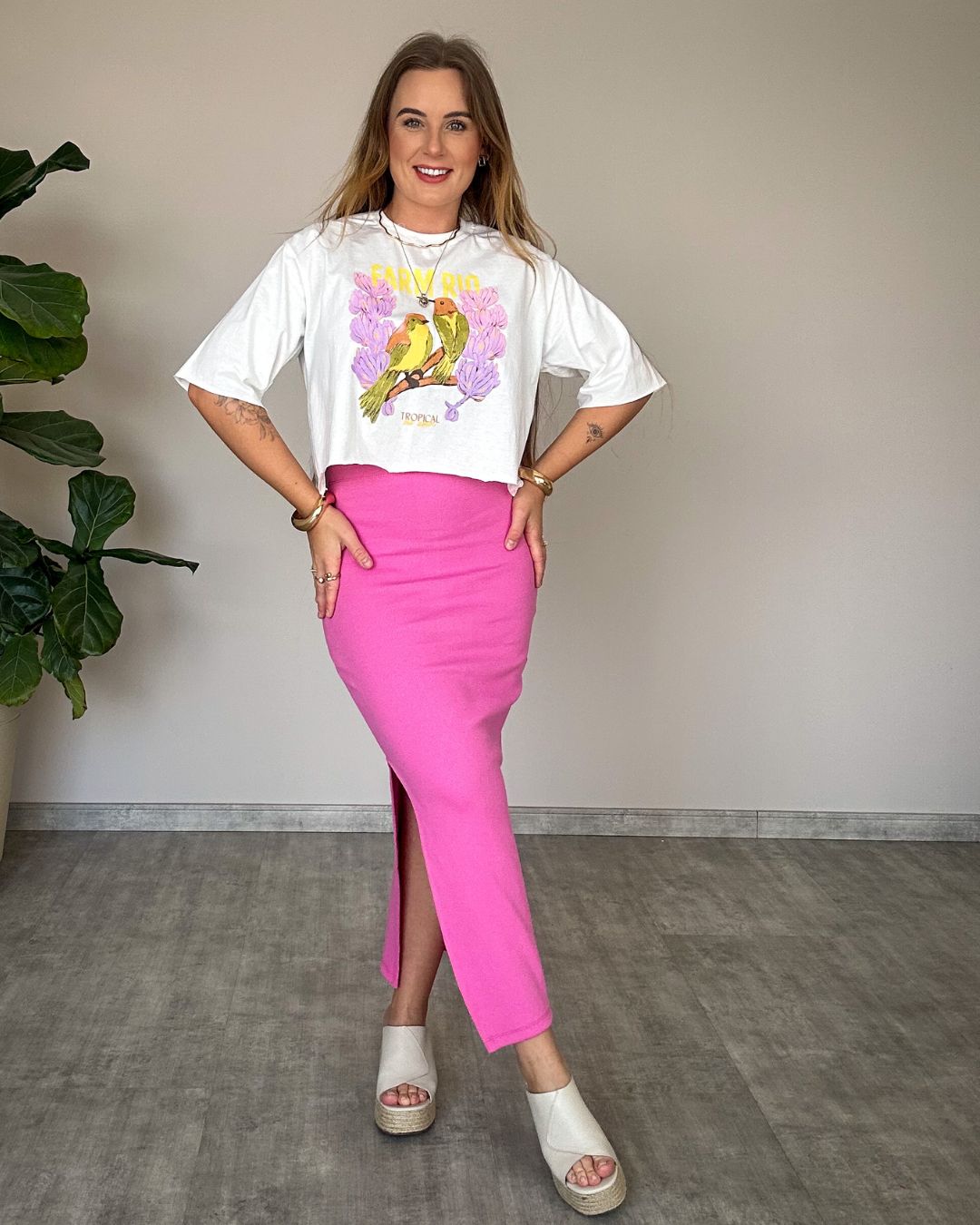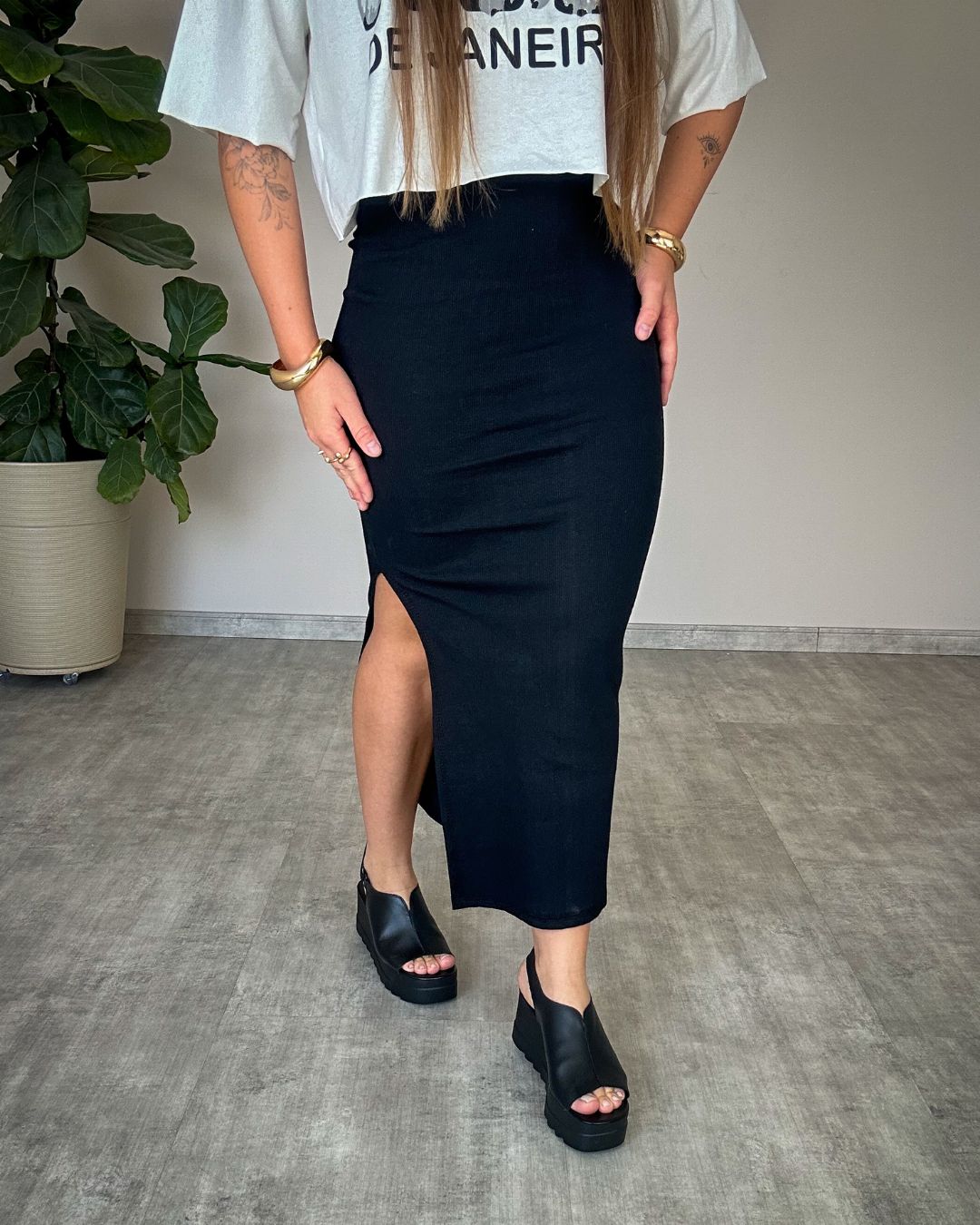 O destaque fica por conta da fenda lateral, que adiciona um toque de feminilidade e movimento à peça, ideal para quem busca um visual atual e versátil.