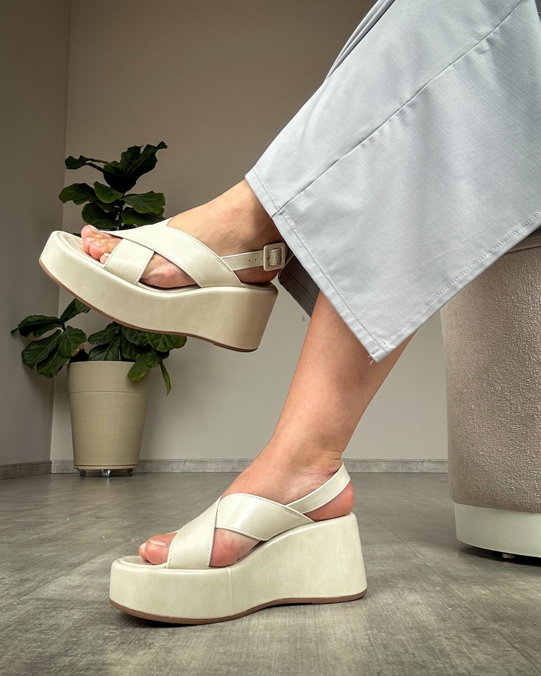 Com design moderno e atemporal, esta anabela plataforma é a escolha ideal para quem busca conforto sem abrir mão do estilo. Versátil e sofisticada, ela traz tiras largas cruzadas no cabedal que envolvem o pé com delicadeza e segurança, garantindo um ajuste perfeito e um visual elegante para qualquer ocasião.