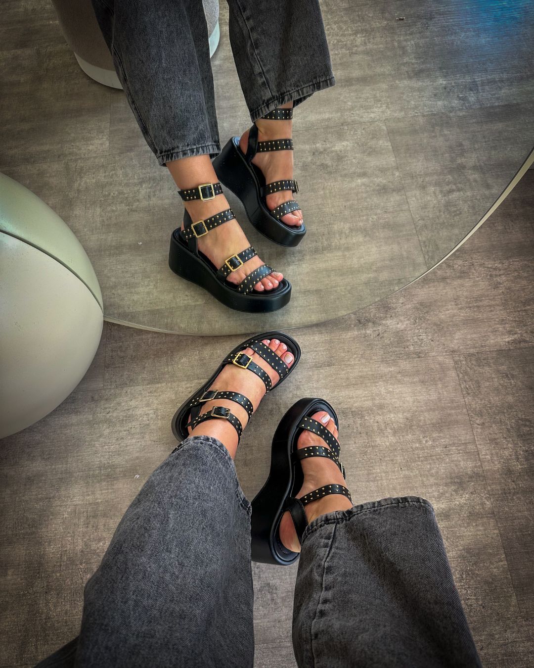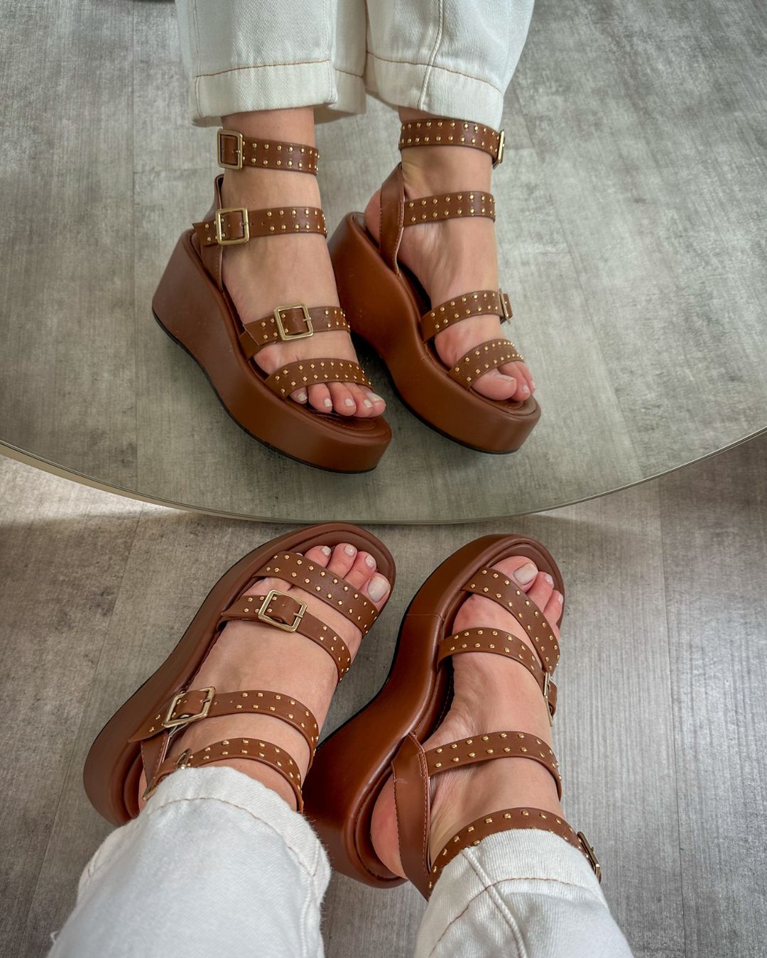 O destaque fica por conta das três tiras com fivelas ajustáveis, que permitem um ajuste perfeito ao pé, além de detalhes em mini tachas que adicionam um toque moderno e estiloso ao visual.