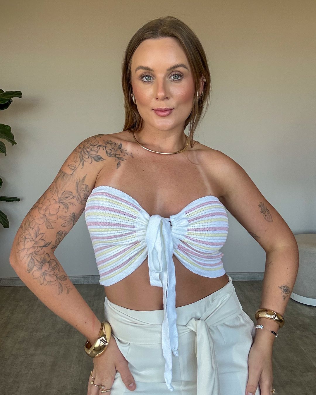 O top faixa de tricot é aquela peça curinga e super versátil que transforma qualquer look! Confeccionado em tricot leve e canelado, com listras em tons suaves, ele traz um toque moderno e feminino na medida certa.
